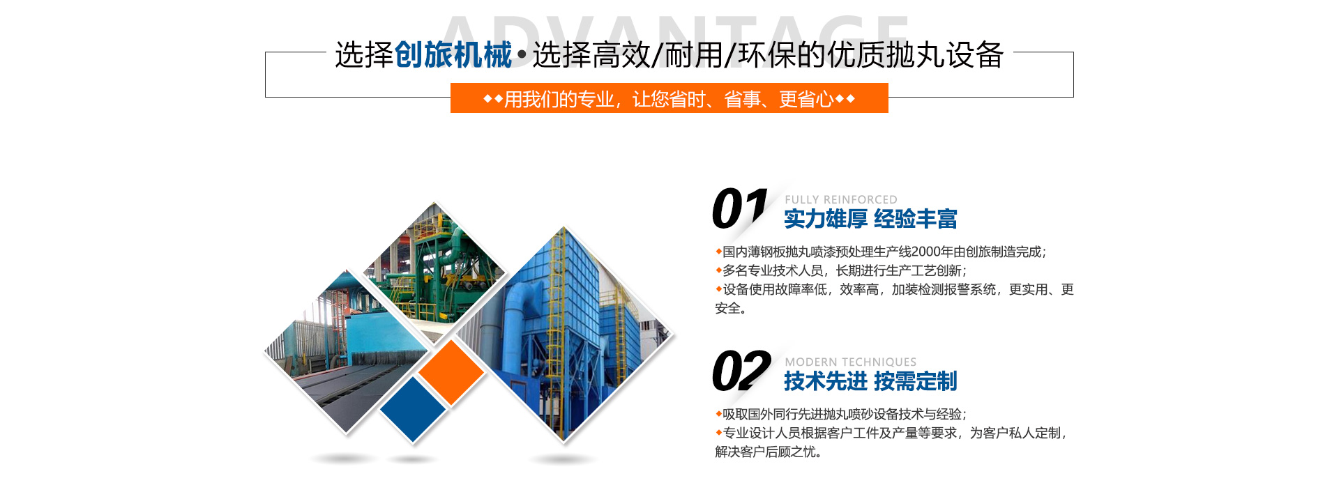 合肥市創旅機械有限公司是專業的噴砂房、拋丸機生產廠家,生產不同型號不同價格的江蘇拋丸機、江蘇 噴砂房、除銹機、拋丸清理機械、自動噴砂機械、通風除塵設備、砂處理成套設備、鋼丸及各種耐磨合金 件的大型專業化制造企業。 我公司愿與各行各業的朋友交往與合作,使您的產品更光彩! 產品有:鋼板預處理生產線,噴砂房,噴砂機械,噴砂設備,拋丸機,拋丸清理機,混砂機,噴丸機 ,拋 噴丸機,履帶式拋丸清理機,鋼板除銹機,鋼材除銹機,板...